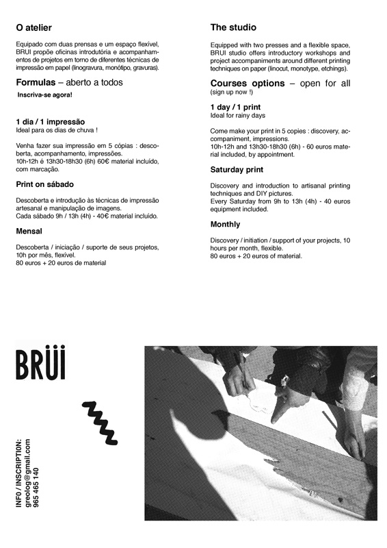 Equipado com duas prensas e um espaço flexível, o atelier BRUI propõe oficinas introdutória e acompanhamentos de projetos em torno de diferentes técnicas de impressão em papel (linogravura, monótipo, gravuras).